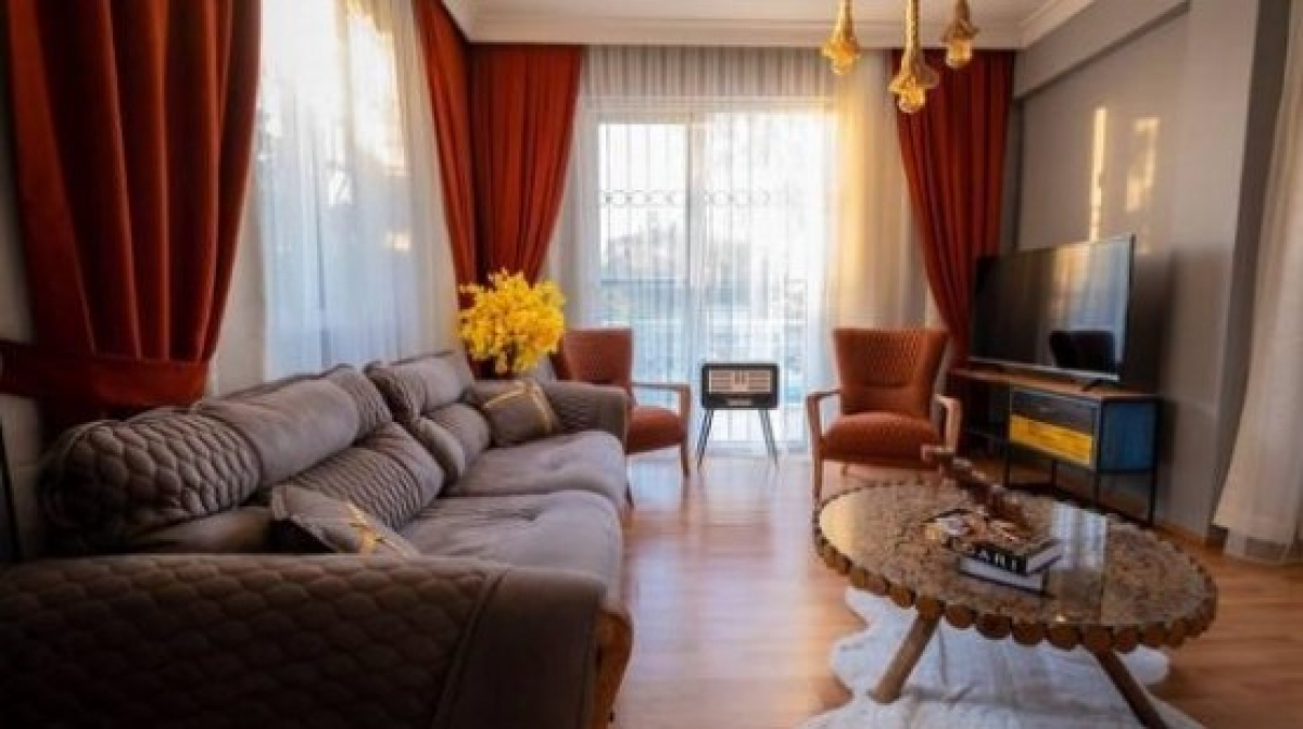 Salon: Özenle döşenmiş açık mutfaklı salon, modern oturma grubu, Kişilik yemek masası, LCD TV ve klima bulunmaktadır.